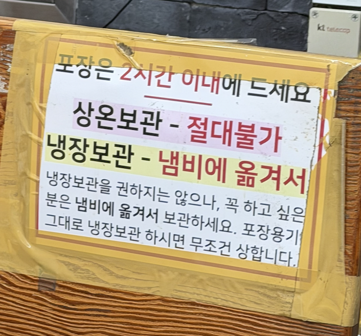다만 포장은 2시간 이내에 먹으라고 당부하시고 계시네요. 상온보관 절대 불가! 냉장보관을 권하지 않으나 냄비에 옮겨서 냉장보관하라고 합니다 포장용기 그대로 냉장보관하면 무조건 상한다고 하네요.