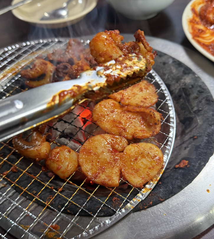 1. 불향 가득한 '쭈꾸미 불고기' 여기는 숯불 석쇠 위에서 직접 구워 먹는 방식이에요. 양념이 빨갛지만 자극적으로 맵기만 한 게 아니라, 감칠맛이 돌면서 불향이 확 살아있습니다. 쭈꾸미가 어찌나 탱글탱글한지 씹는 재미가 일품이에요!