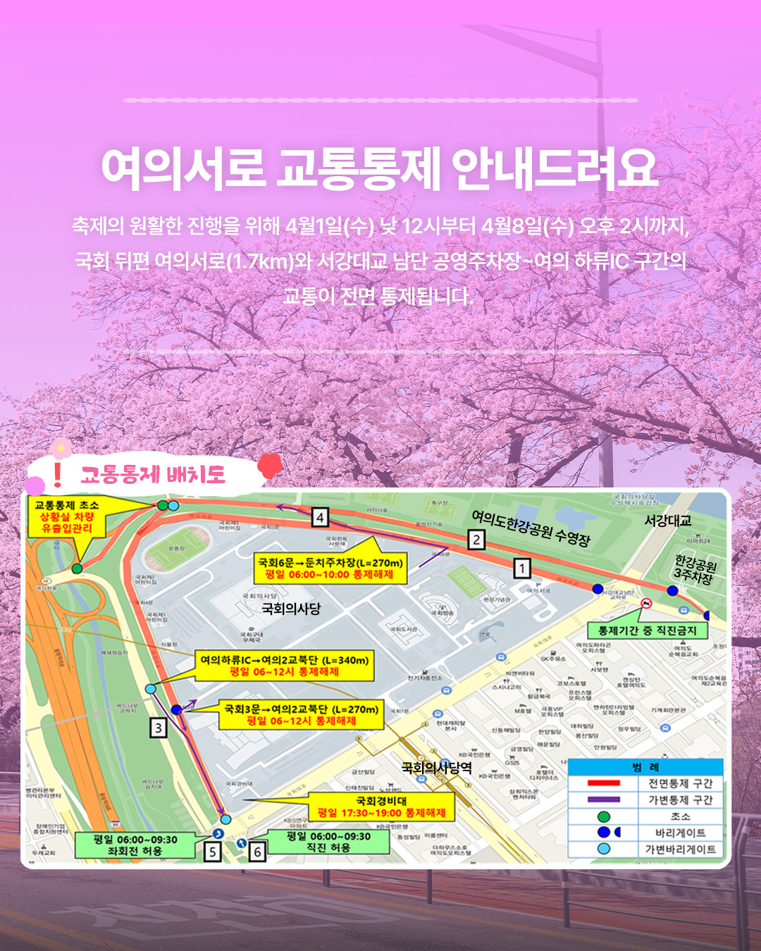 - 영등포 여의도 봄꽃 축제 기간 동안 축제의 원활한 진행과 안전한 관람을 위해 여의서로 일대 차량 통행이 제한됩니다🌸