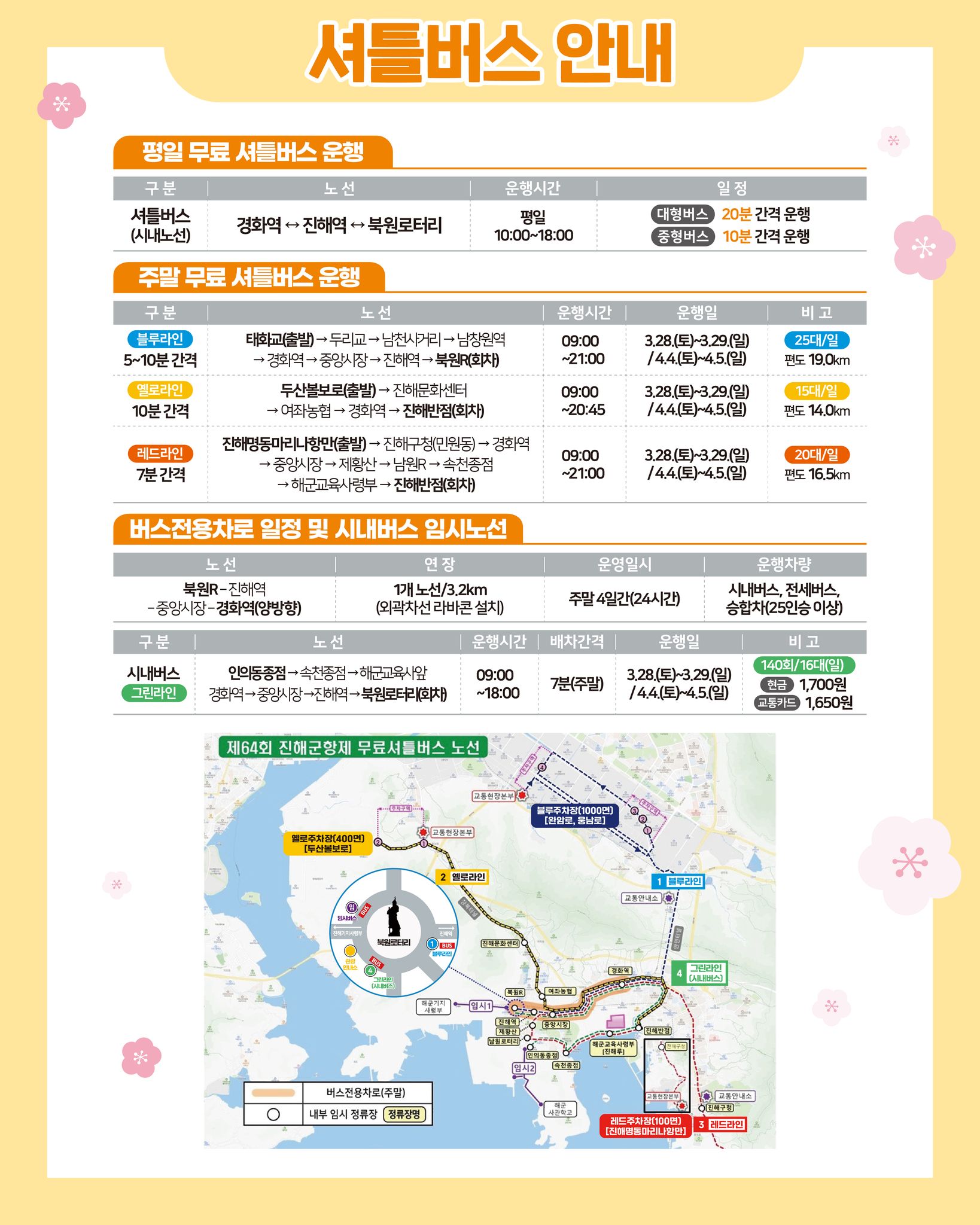 - 주차 전략: 축제 기간 진해 시내는 차량 진입이 매우 어렵습니다. 진해 외곽에 마련된 셔틀버스 전용 주차장을 이용하고 무료 셔틀버스를 타는 것이 시간과 에너지를 아끼는 유일한 길입니다.